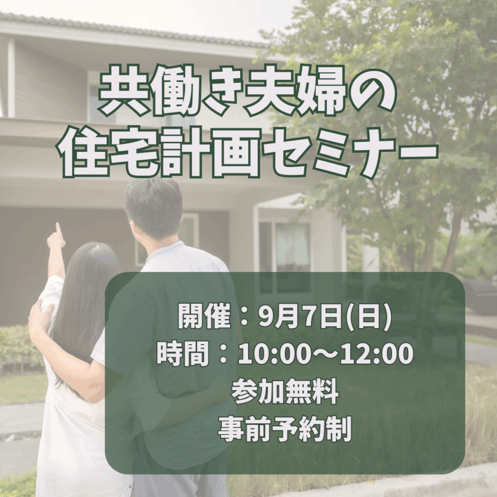 この「共働き夫婦の住宅計画セミナー」は、夫婦それぞれのキャリアと収入を最大限に活かす資金計画と、日々の忙しさを劇的に解消する間取り設計のノウハウに特化し、「仕事も家庭も充実させたい」と願う共働き夫婦を成功に導きます。